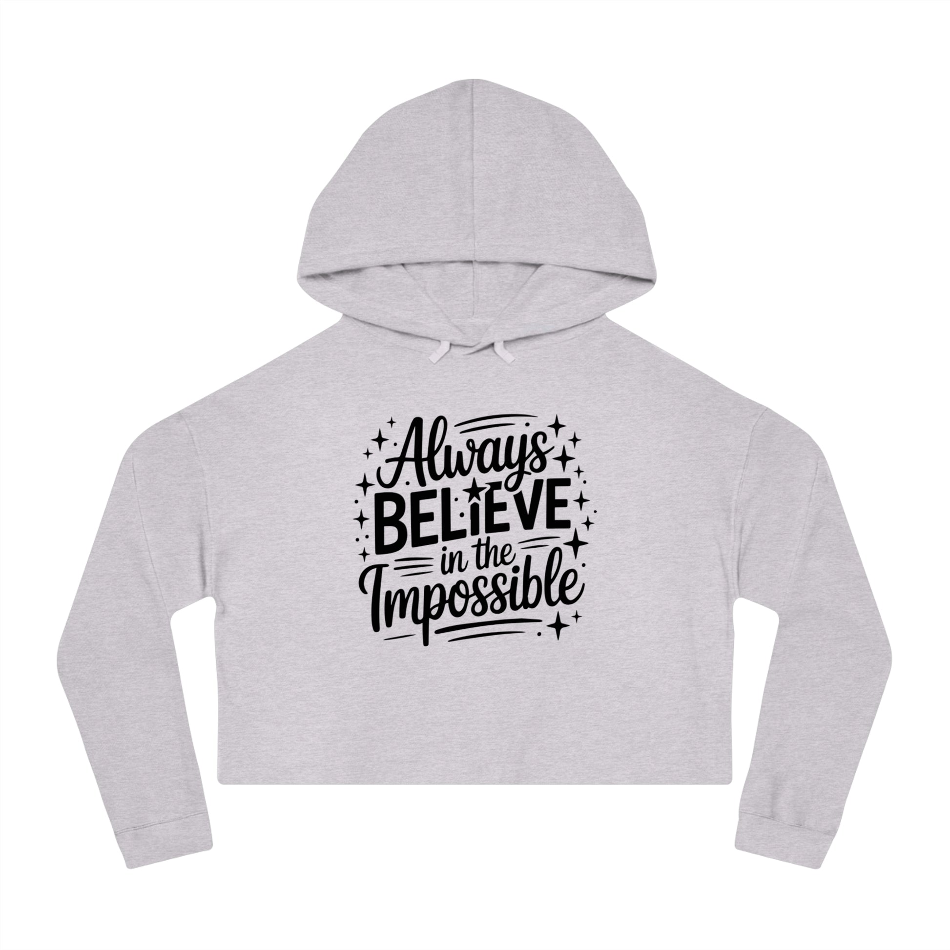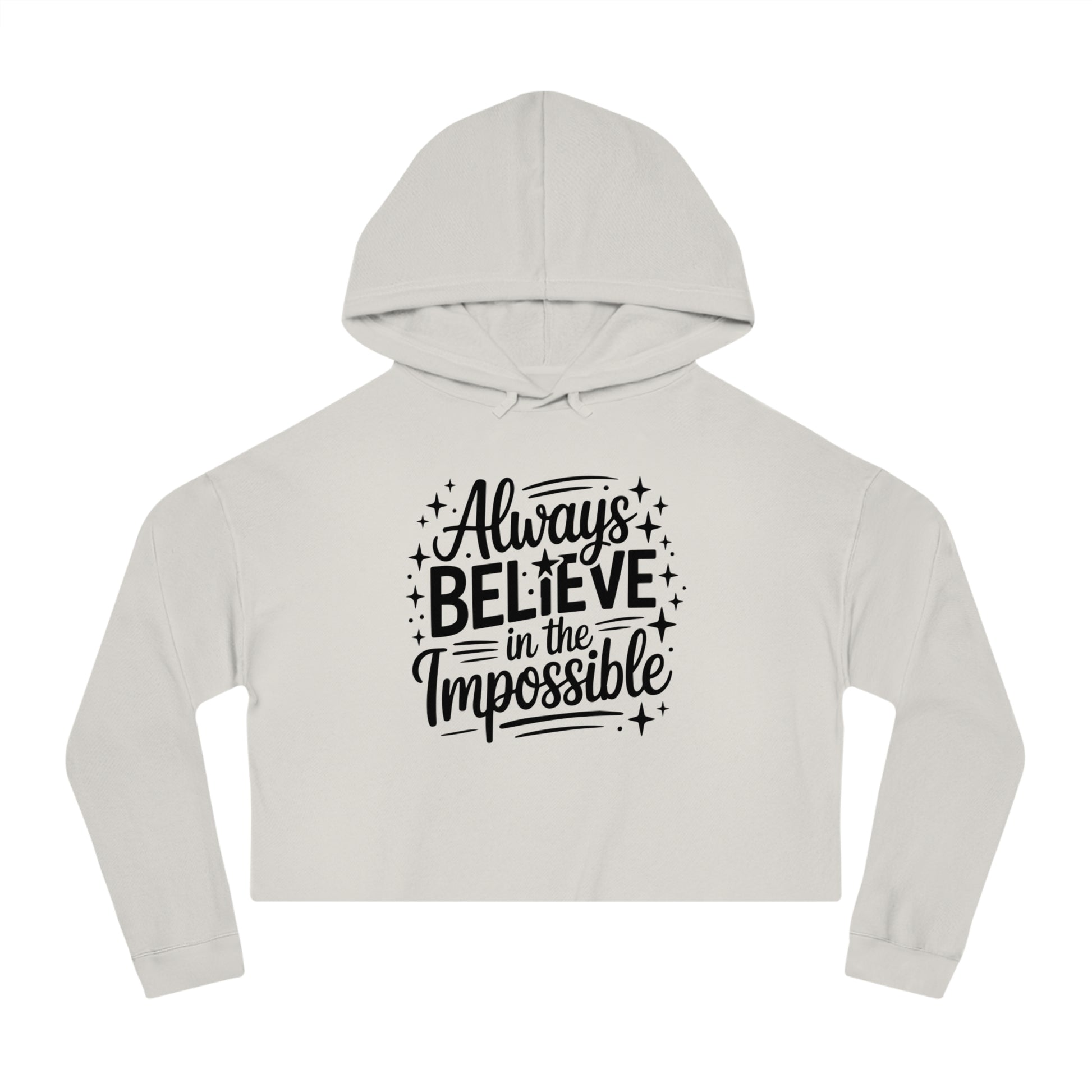A soft, cropped hooded sweatshirt that reads like a quiet reminder to keep going. The relaxed, slightly boxy cut sits just above the waist, pairing easily with high-waisted jeans or layered under a coat. The brushed cotton-blend feels warm and familiar against the skin, while the adjustable hood and ribbed cuffs move with you and hold their shape. Hand-lettered front lettering, surrounded by tiny sparkles, offers a gentle, hopeful message—reach beyond the ordinary, keep trying, stay curious—made for slow mornings, studio breaks, and crisp-air walks. Small, thoughtful details—like twill neck tape, a tear-away label, and double-needle stitching—keep it comfortable and built to last. Wear it when you want a casual silhouette with a quiet, resilient energy.